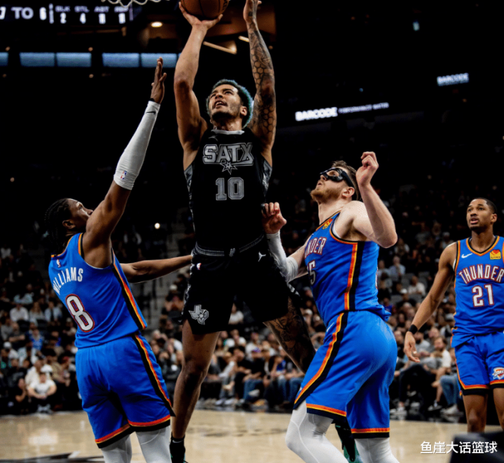 第三节比赛雷霆一波13-4完成反超,后面福克斯得分止血,但杰威也得分回应,福克斯中投命中后哈滕扣篮得分,接下来两队打得激烈,在卡斯尔等人发挥下马刺也一直紧咬比分,甚至后续在索汉打成2+1后马刺还曾完成反超,但很快亚历山大给予回应,加上维金斯命中三分,雷霆又慢慢领先到6分,关键时刻索汉扣篮得分止血,之后卡斯尔追分时,维金斯、华莱士命中三分,三节比赛结束雷霆领先8分。第四节比赛马刺打出一波5-0,后面杰威命中三分,卡斯尔得分后杰威继续命中三分,卡鲁索快攻得分后雷霆领先8分。暂停后瓦塞尔得分止血,但马刺防不住雷霆,雷霆多点开花还是慢慢领先到了13分,喊了暂停后马刺难止颓势,杰威、华莱士、哈滕继续扩大领先,眼看这样的情况马刺率先放弃比赛,最终雷霆大胜马刺。